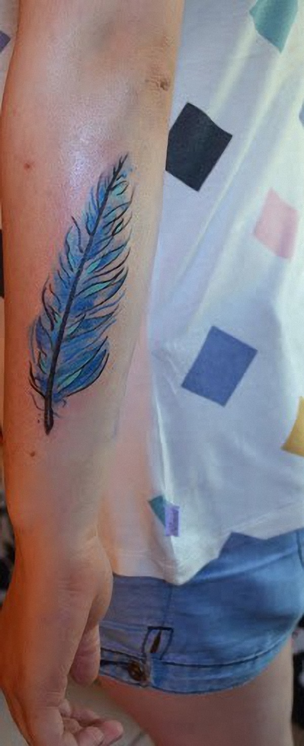 O braço, de cor azul, de penas de desenho de tatuagem é melhor para os homens. Este tipo de tatuagens coloridas estão disponíveis em versão temporária em muitos tatuagem, lojas de arte.